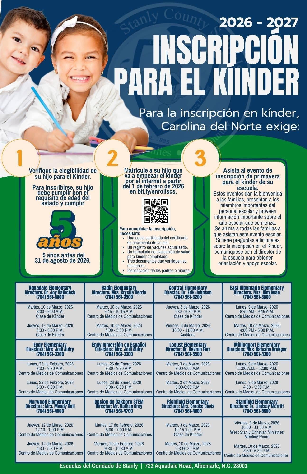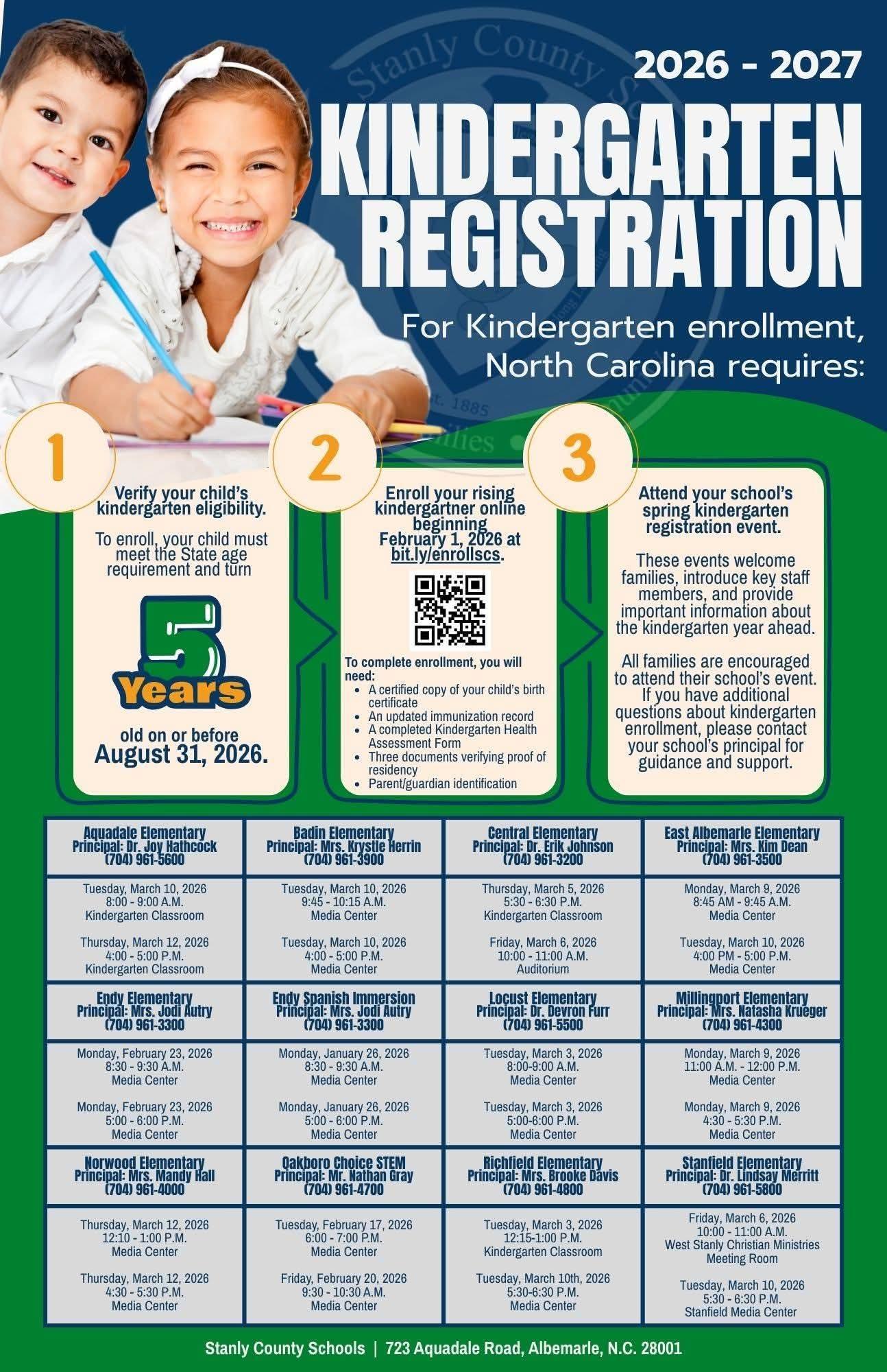 Kindergarten Registration for the 2026-2027 school year will open on February 1st. To enroll, your child must turn 5 years of age on or before August 31, 2026. All enrollments are completed online at bit.ly/enrollscs. You are also invited to join us for our Kindergarten Registration event on Tuesday, March 3rd, to learn more about kindergarten expectations and enrollment. We will have two sessions for you to attend 8:00-9:00 AM and 5:00-6:00 PM.