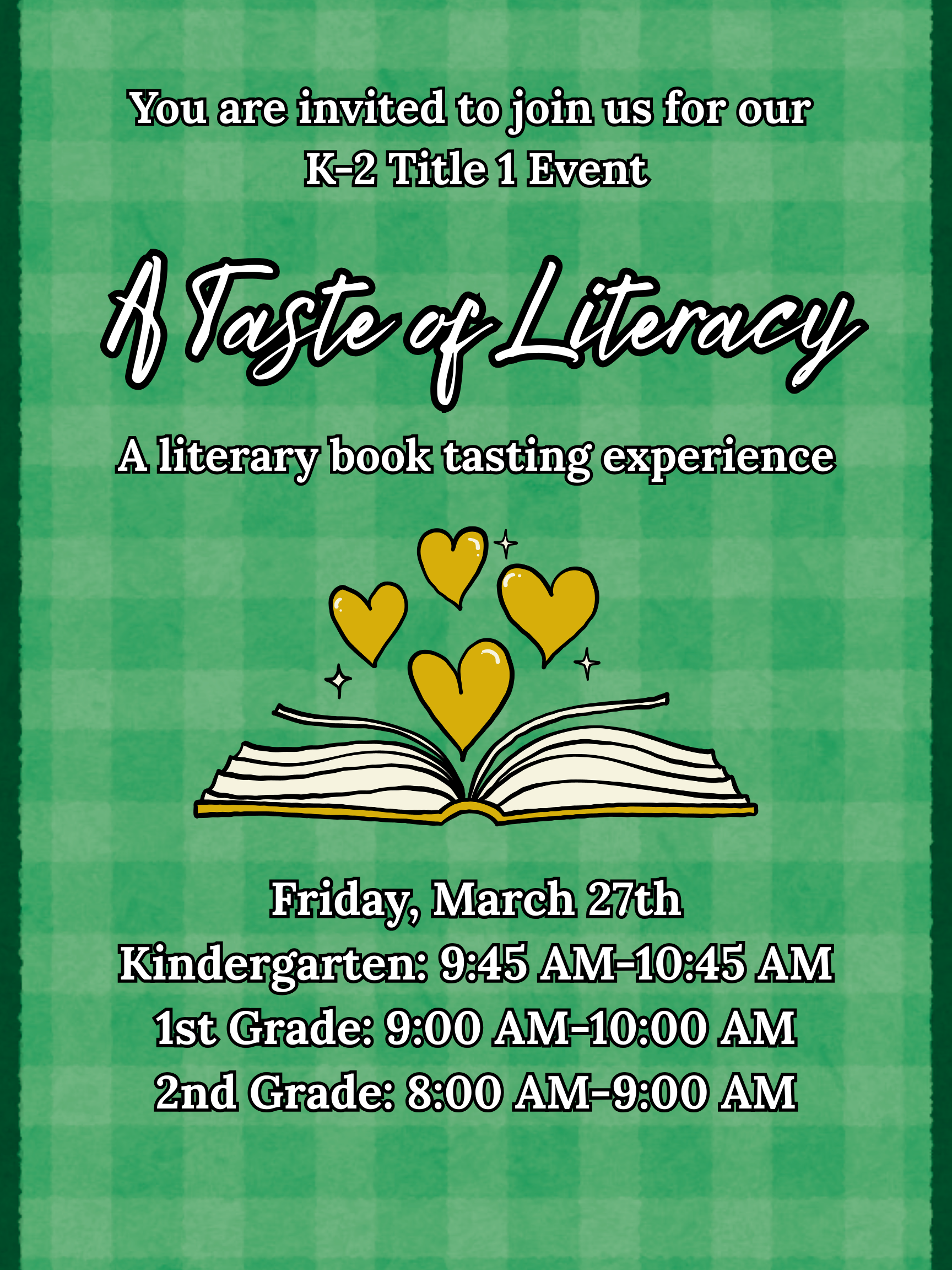 Attention K-2 Parents: We are delighted to invite you to our next Title 1 event, “A Taste of Literacy.” We hope to see you there!